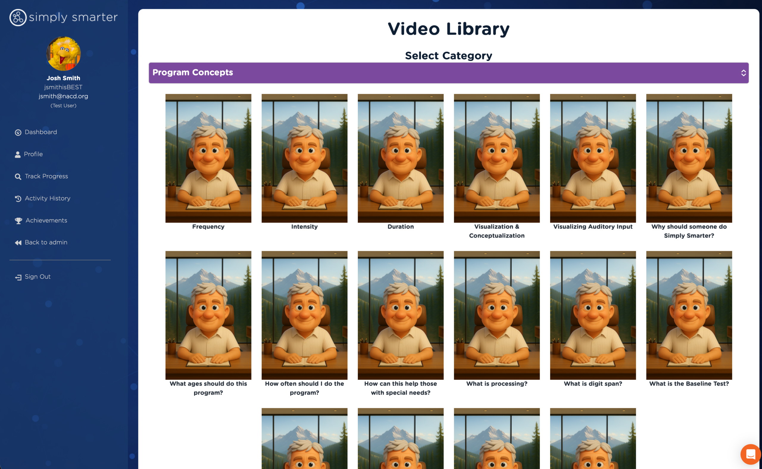 Simply Smarter 2.0 includes a Video Library — animated videos by Bob Doman covering Frequency, Intensity, Duration, Visualization, Conceptualization, and more. The same philosophy and guidance NACD provides to its clients, built directly into the program.